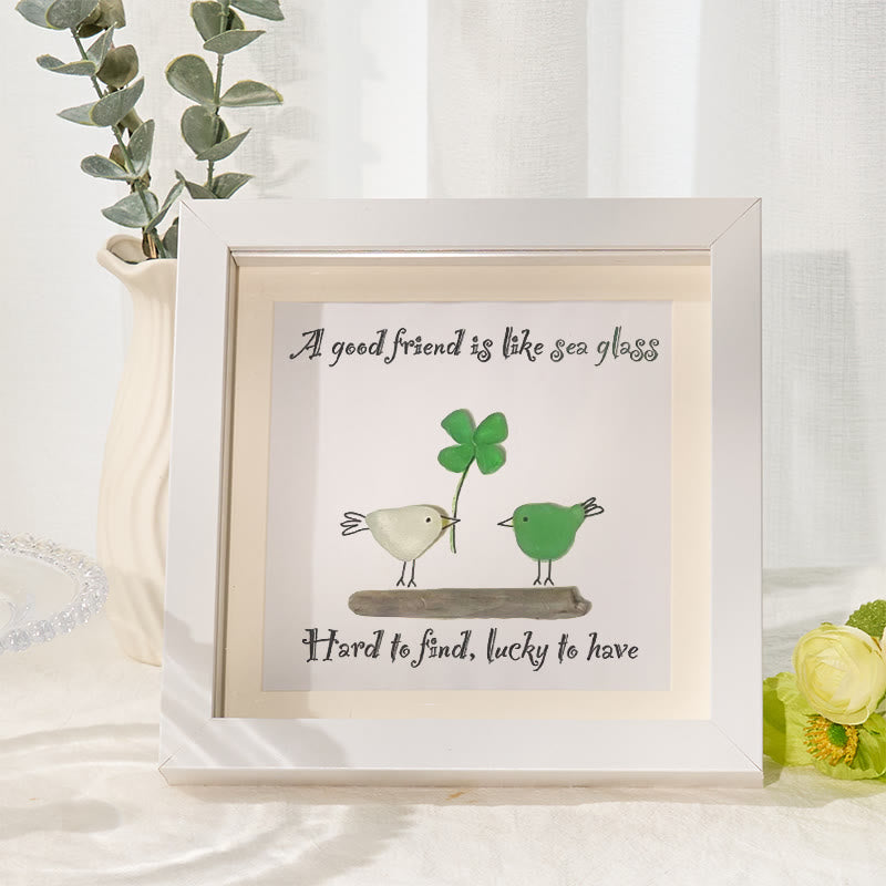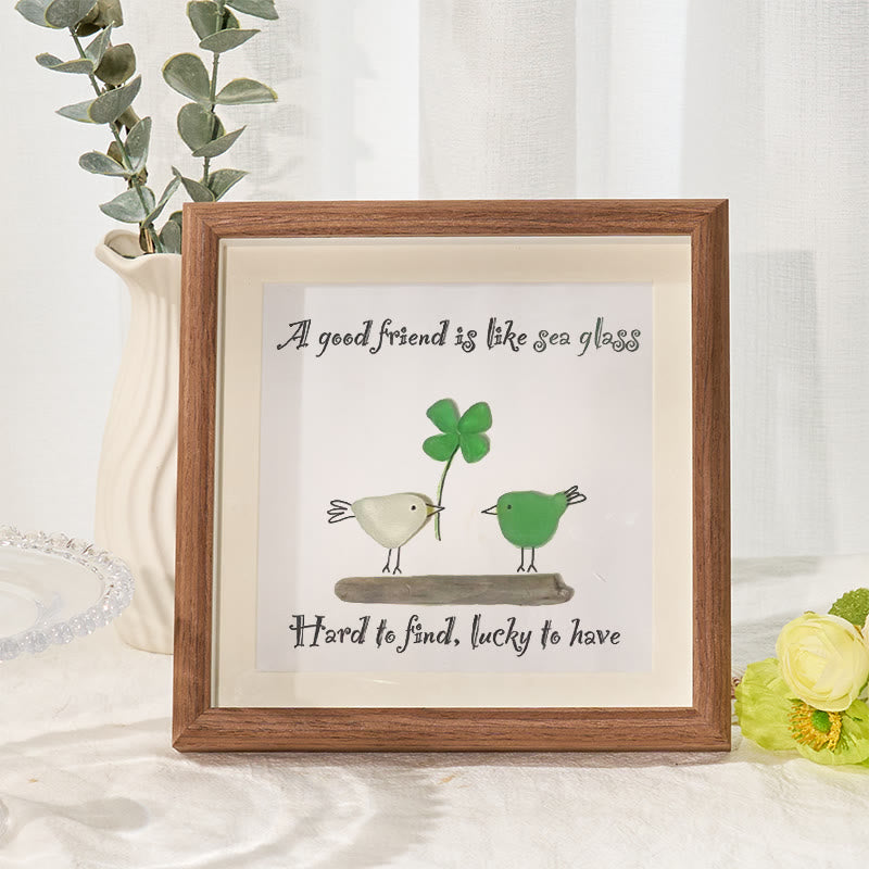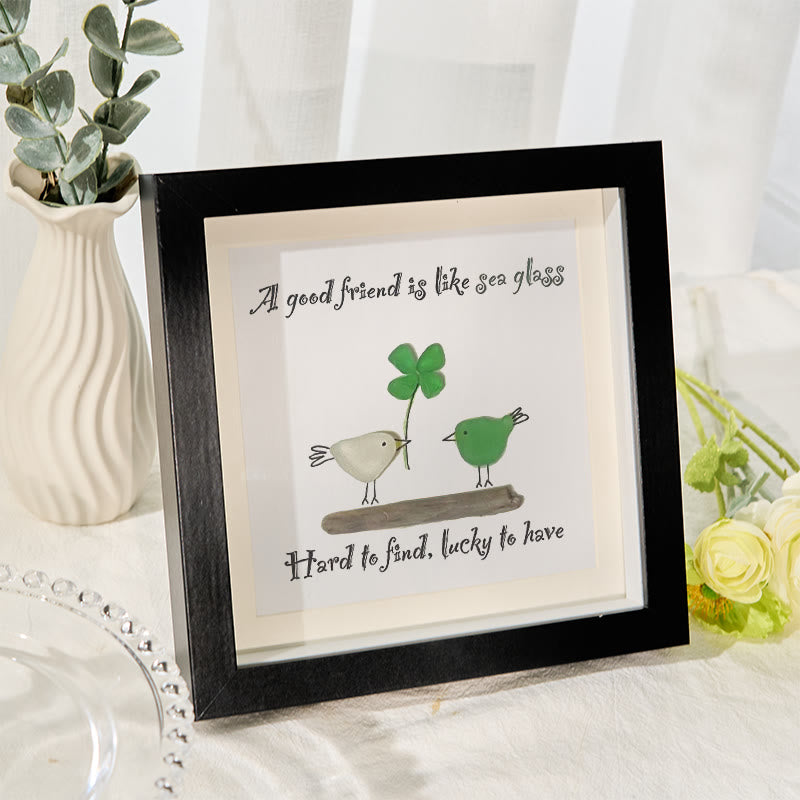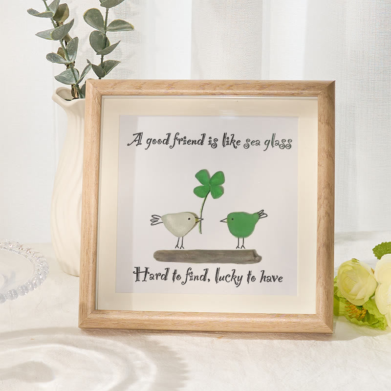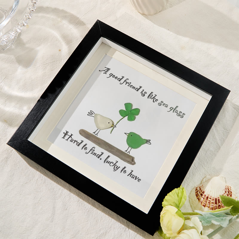 🐦🍀🐦Celebrate the rare and precious gift of friendship with our Sea Glass Framed Art, depicting a sweet moment where one bird offers a four-leaf clover to its friend. 🌊💎Crafted from sea glass, this artwork beautifully symbolizes the luck and love found in true friendships. Accompanied by the heartfelt quote: