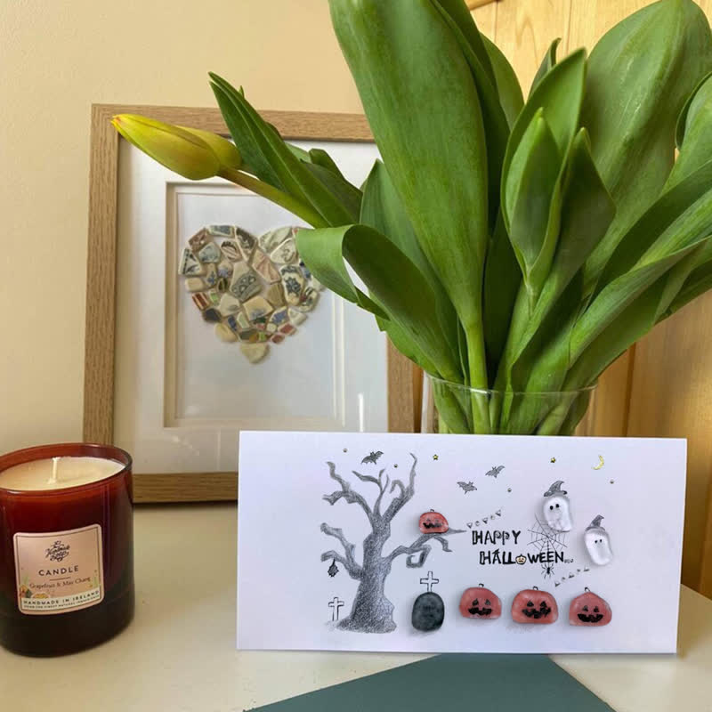 💎🌊Crafted from vibrant sea glass, this playful piece captures the fun and festive spirit of Halloween, featuring friendly ghosts and glowing pumpkins. Paired with the cheerful message “Happy Halloween”.🎃👻