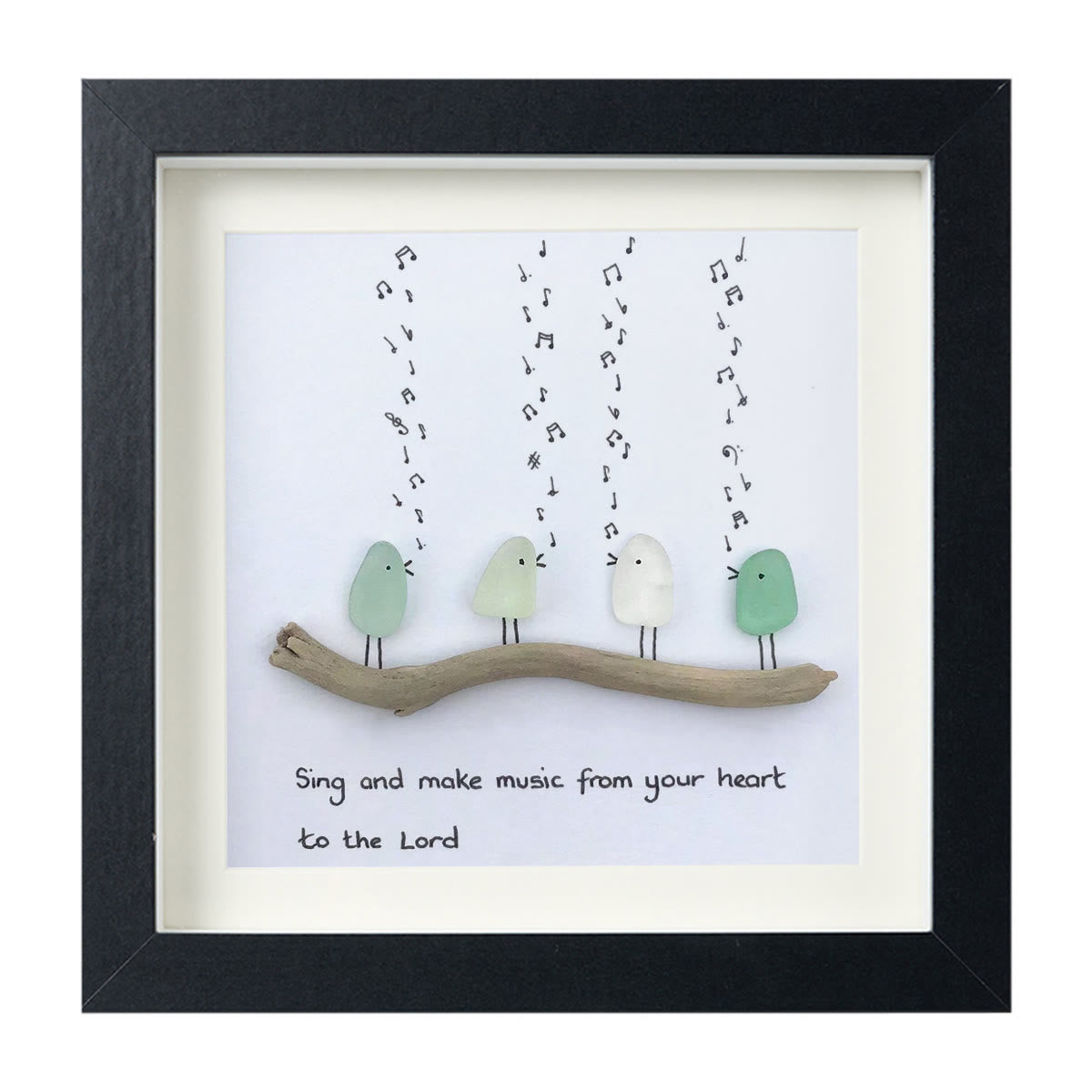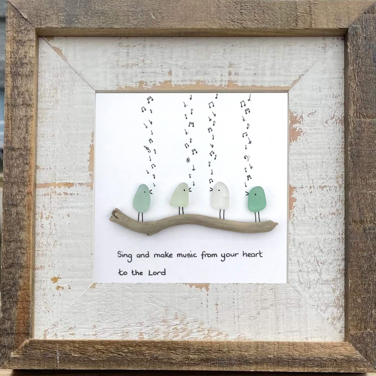 🎵🐦Four sea glass birds in shades of light green and white are sitting on a driftwood branch and singing. Beneath the driftwood a handwritten quote: “Sing and make music from your heart to the Lord”, turning the whimsical scene into a quiet, uplifting reminder to embrace gratitude and praise.