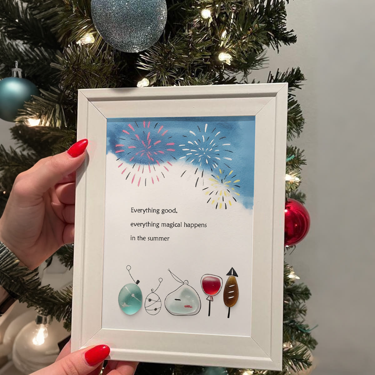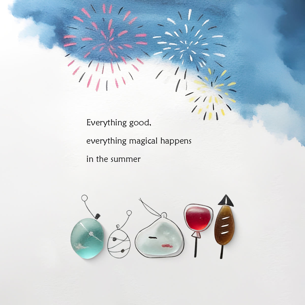 🎇This charming piece pairs naturally smoothed seaglass with summer motifs, everything were set under watercolor fireworks for that perfect sunny vibe. It features the cozy quote: "Everything good, everything magical happens in the summer"—turning it into a sweet tribute to warm, joyful days.