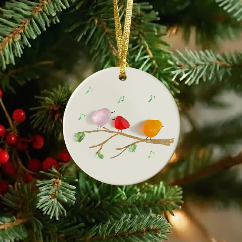 🐦Crafted with sea glass set on a smooth white ceramic disc, this ornament turns nature’s treasures into a charming scene: three cheerful birds perched on a branch, surrounded by tiny green glass "leaves" and musical notes—symbolizing joy, connection, and the sweet melodies of togetherness.🎶